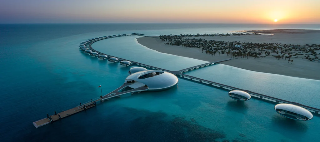 Shebara Resort in the Red Sea region explores futuristic design shaped by environmental responsibility. Villas hover above clear waters, supported by columns that minimize seabed disturbance. Their layout ensures gentle airflow, uninterrupted views and minimal shadowing on sensitive marine zones.