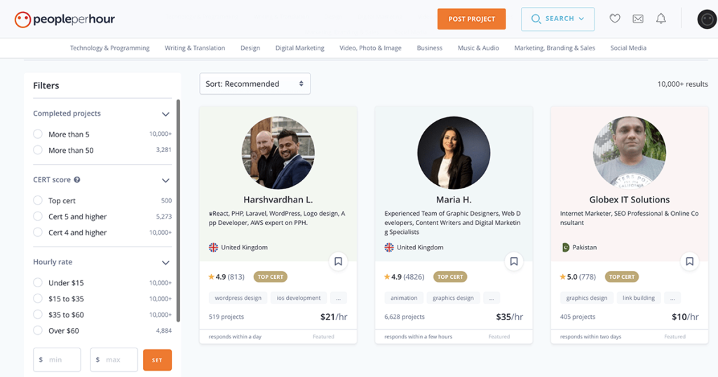 PeoplePerHour is a UK-based platform that connects freelancers with clients worldwide. It’s beginner-friendly because it allows both project bidding and predefined service listings, similar to Fiverr’s gigs. Beginners can start with small projects to gain experience and gradually move toward higher-paying opportunities.