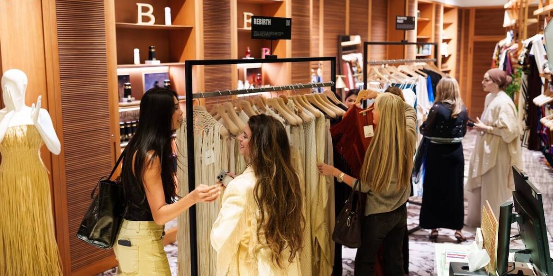 Rebirth, founded by Tala Abukhaled in 2021, brings a fresh, bohemian-inspired approach to luxury fashion. The brand is rooted in the belief that fashion should be an experience that connects the wearer to nature, art, and sustainability. The Spring/Summer 2026 collection showcased at the Dubai pop-up was titled “Tactile Gestures” and was a striking display of luxury bohemian designs that highlight fronds, beaded detailing, and natural textures.