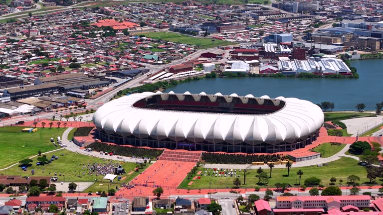 GQEBERHA, SOUTH AFRICA – NOVEMBER 24: In an aerial view, Nelson Mandela Bay Stadium stands near the industrial side of the city, on November 24, 2024 in Gqeberha, South Africa. The stadium, located in the city formerly called Port Elizabeth, was built for the FIFA 2010 World Cup and designed to shield spectators from wind and sun. (Footage by Henrique NDR Martins/Getty Images UGC)