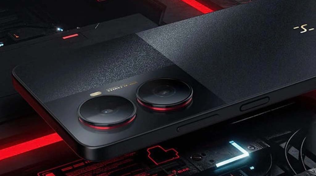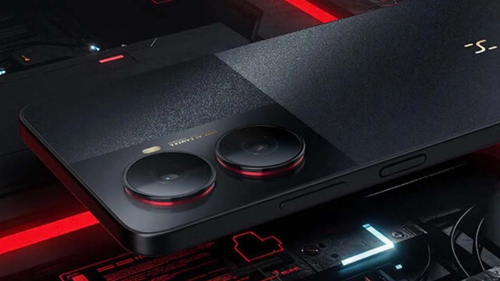On the front, the phone adopts a punch-hole camera design for a modern look, while the rear panel stands out with two large camera rings that add a bold visual identity. The overall design balances simplicity with contemporary styling, appealing to younger users and first-time smartphone buyers.